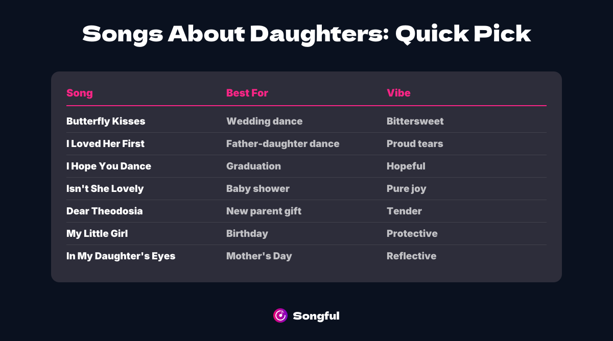 Looking for songs about sons instead? We have a separate guide: Songs About Sons That Capture What You Can't Say.