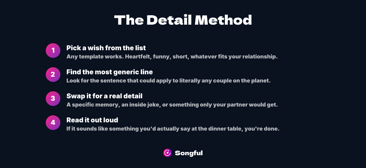 Go with what's natural for your relationship. If you two communicate through sarcasm and inside jokes, a funny wish will feel more genuine than something pulled from a poetry book. If your partner values sincerity, lean into that. You can also do both: open with something that makes them laugh, then close with a line that's real. Just don't force a tone that doesn't match how you actually talk to each other.