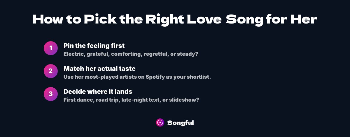 Context changes everything. The same song works at a wedding first dance, a road trip, a Tuesday-night text, or the soundtrack to a slideshow. Figure out where the song will be heard before you pick one.